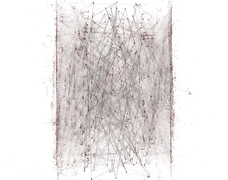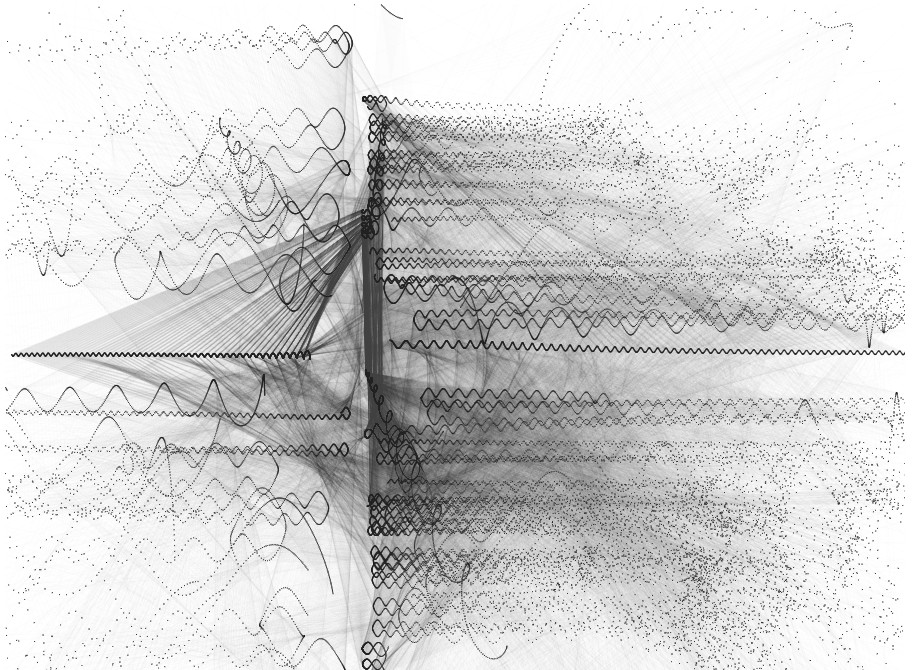 Eqgen is an experiment to create visuals from mathematical expressions. It consists of a customizable expression generator and simple canvas rendering. The generator takes a (user-defined) set of functions and operators and a set of constant values and variables and then randomly builds expresssions for x,y coordinates and r,g,b color values, this system is then continuously evaluated to plot points on the canvas.