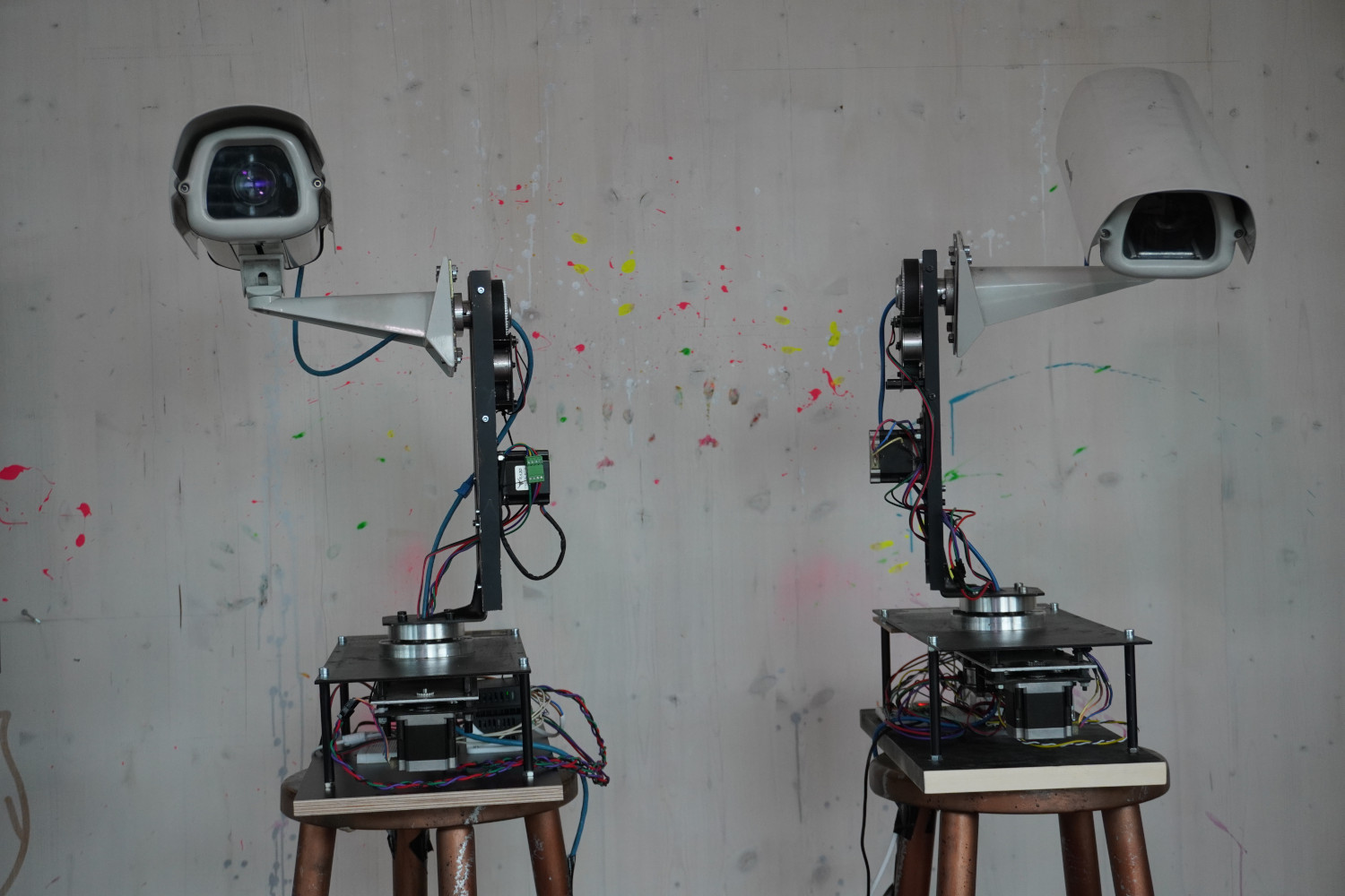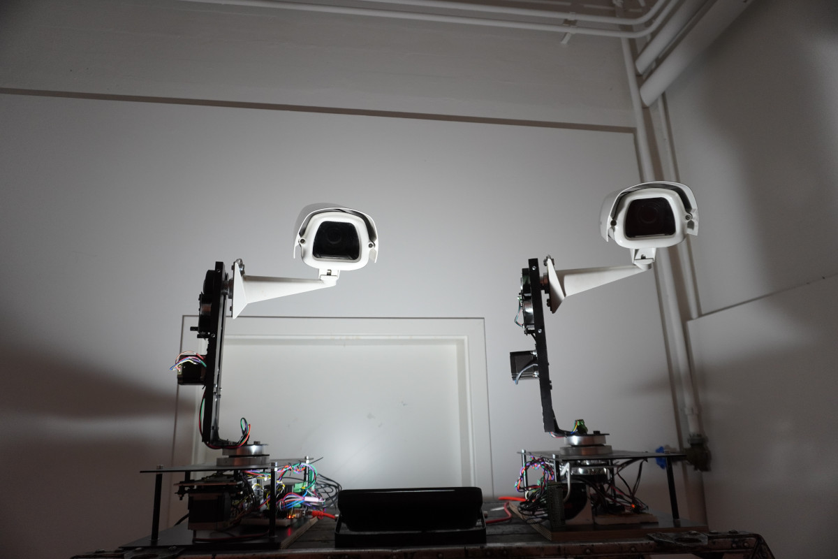Watching the surveillance industry in an intimate moment. A robotic installation with moving surveillance cameras.