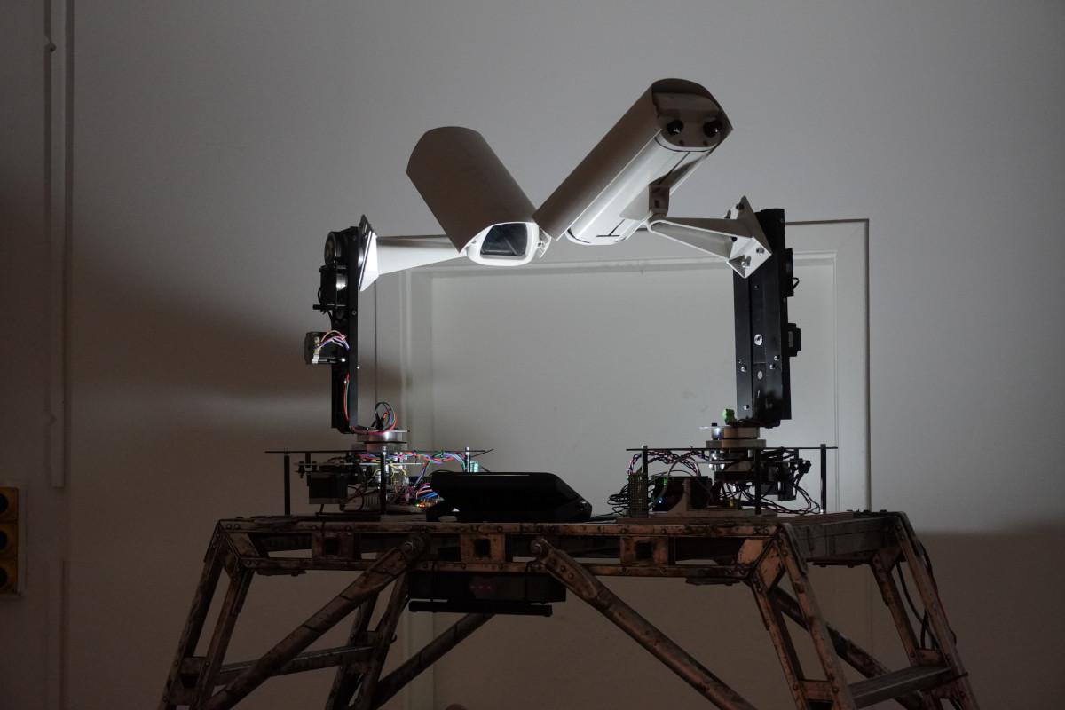 Two robotic surveillance cameras enjoy an intimate moment, soft movements and touch, a kind of dance. But if one steps too close to the cameras, they quickly jerk and move their gaze towards the intruder, they are now forced to do their work: Surveillance. After a while they resume their robotic dance.